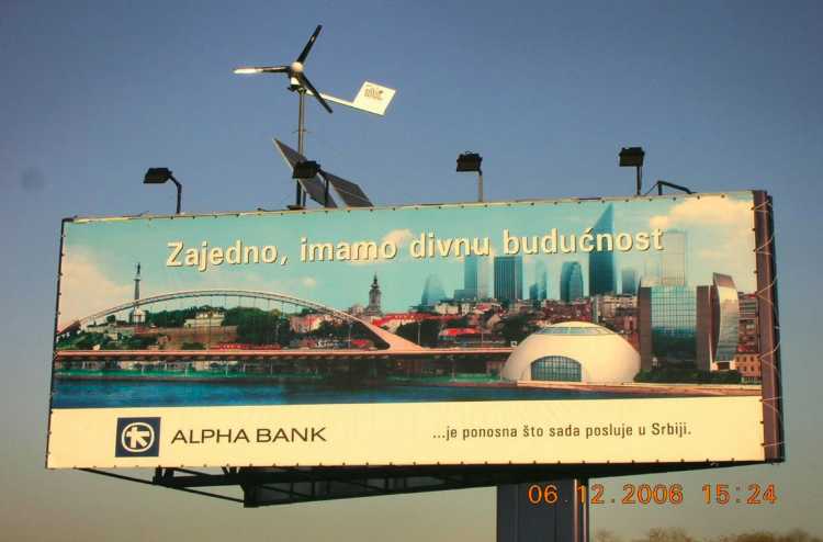 Obzirom da smo imali problem sa osvetljenjem jednog superborda dimenzija (12x5) metara, a koji se nalazio pored autoputa ka aerodromu bilo je potrebno pronaći rešenje za njegovo osvetljavanje. Izvor struje se nalazio predaleko, pa mi je na pamet pala ideja da ga osvetlimo uz pomoć solarne energije. Institut Vinča nam je izašao u susret i uradio projekat. Posle par meseci testiranja, shvatili smo da će nam biti potrebno još energije pa smo napravili i dodali jednu malu vetrenjaču na vrhu panoa i zamenili obične sijalice (koje su trošile previše) za modifikovane rudarske lampe.