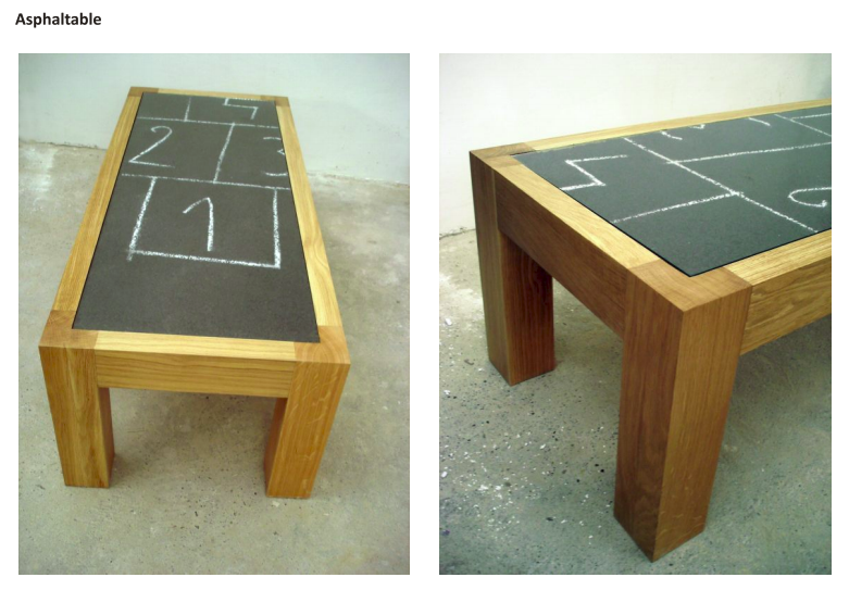 Zamolili smo Beograd put da nam izlije jednu asfaltnu ploču i pokloni. Tu ploču smo ugradili u sto, nacrtali igru školice i nazvali ga “Asphaltable”, a koji je trebalo da predstavlja naše urbano detinjstvo.