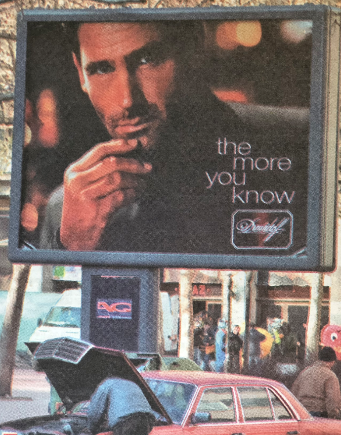 U vreme kada je najbesnije vozilo koje se kotrljalo po ulicama Beograda (ukoliko ga je vozio običan smrtnik) bio Mercedes-Benz W123, a ostale članice voznog parka Beograda bile Lada, Yugo Koral, Zastava, Peglica, Trabant i poneki Reno, najveća kampanja na OOH mediju je bila za Davidoff, postavljena na čak 74 prosvetljena bilborda sa čuvenim sloganom The more you know. Bez prevoda i suvišnih objašnjenja, kampanja je “radila posao”.