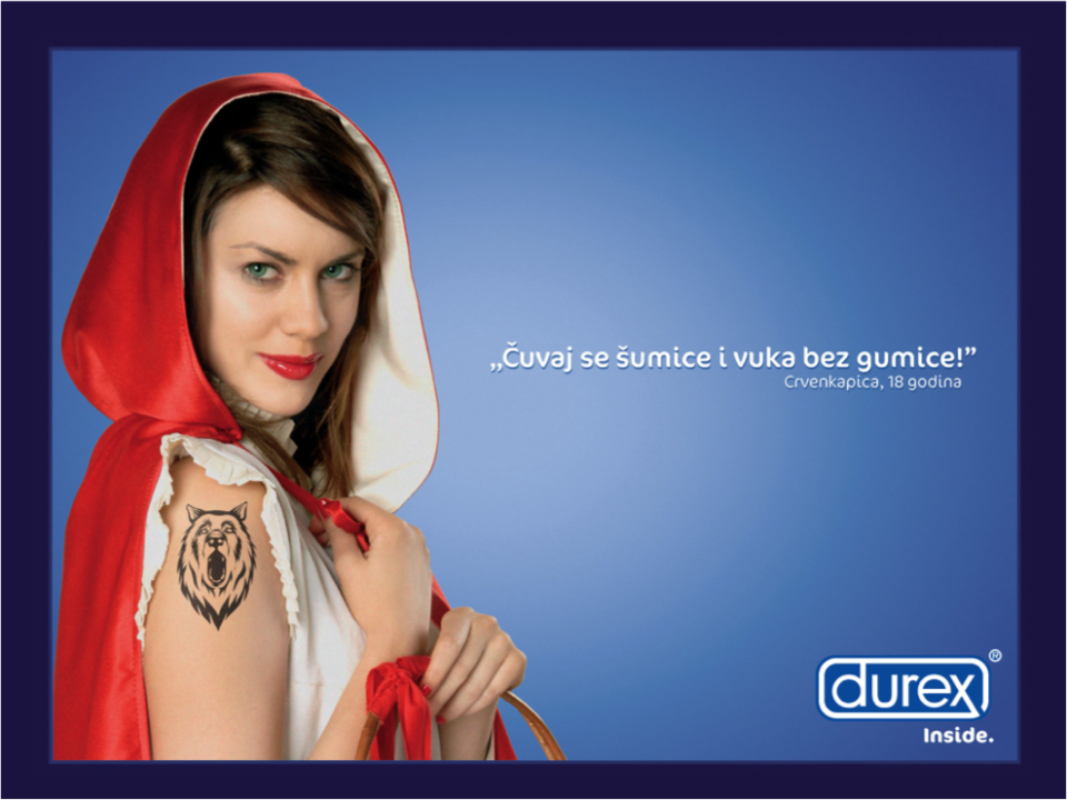 9. oktobra 2006. godine smo svi kolektivno pocrveneli. Durex je u svom stilu izbacio reklamu “Čuvaj se šumice i vuka bez gumice”. Polemika oko kompatibilnosti poruke i ciljne grupe je izazvala borbene pokliče među redovima roditelja. Stručnjaci su komentarisali cilj. Ako je bio čista provokacija, kampanja je bila pun pogodak, ali ako je cilj bio efektnost, postoji bojazan da privlači pažnju dece, dok kod tinejdžera izaziva kontraefekat zbog njihove averzije prema tome da ih neko i dalje tretira kao decu.